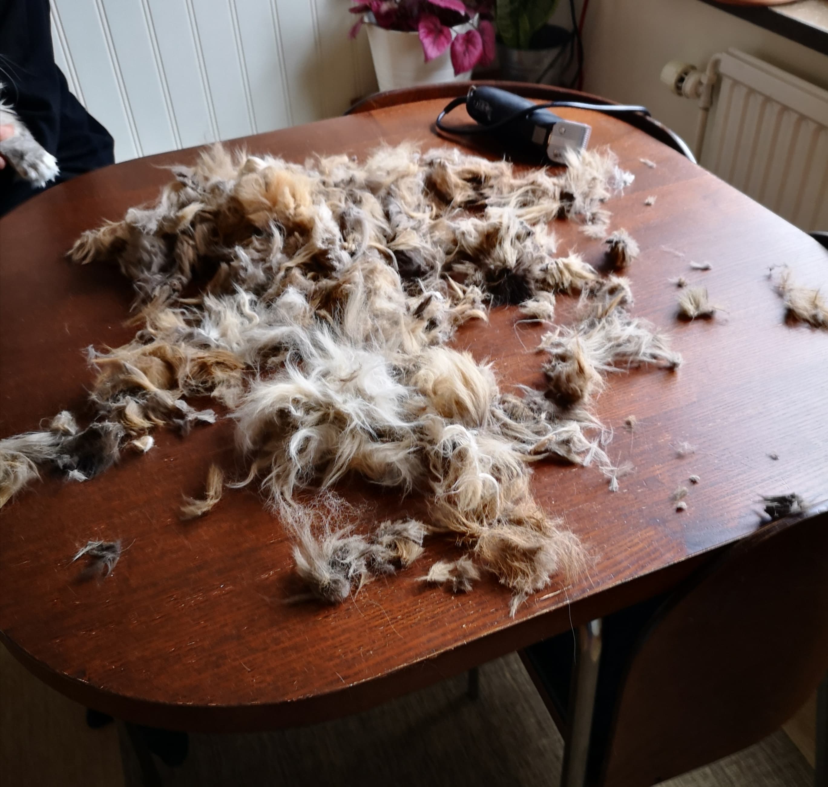 Idag har Dufa och Daytona blivit rakade. Inte för att jag gillar nerrakade Maine Cooner, men de har hiskeligt jobbiga pälsar. De blir jättetoviga, då de inte accepterar kammen. Tur att de bara är två här som inte gillar kammen, de andra njuter av att bli kammade. På bilden är det lite ”rester” från Daytona. 🙂 Maskinen som används är en Moser, som vi haft i många år.