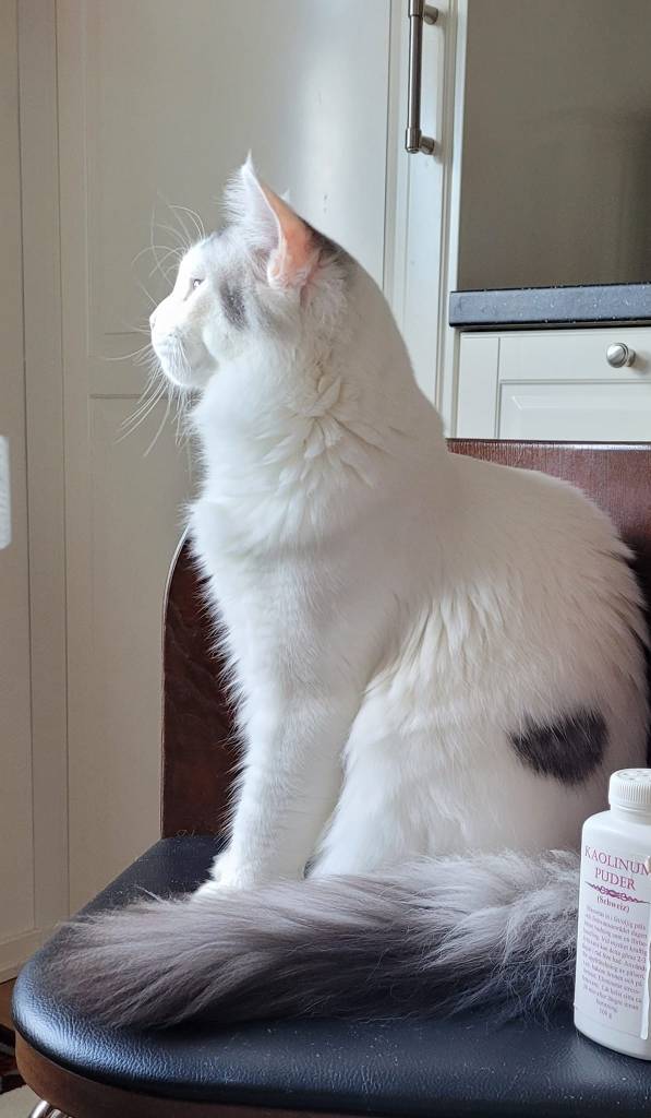 Tiago har vi väntat länge på 🙂 Han kommer från Belgien, med lite nya linjer till Sverige. Hans pappa i sin tur kommer från Maine i USA. Tiago är en rejäl kille i benstommen (nu vid 3 års ålder väger han över 9 kilo). Han är väldigt mjuk och fin i sitt sätt. Älskar att kramas och gosa med matte. Gett 15 ungar efter sig (av dessa så är det 13 hanar + 2 honor). Tiago har nu fått en ”chipkastrering” och kommer vila från brudarna ett tag 🙂